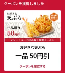 かき揚げ100円引きクーポンか天ぷら50円引きクーポンか大根おろし無料クーポンか。当たると気分が上がりますよね。