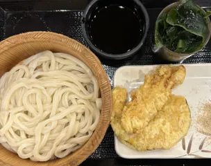 小雨の中いそいそと早歩きで丸亀製麺到着😊タイミングが良かったのかそれほど列も長くなく注文できましたーかぼちゃ揚げたてでーす♪を素早くいただき、かしわ天も追加猫舌なので釜揚げはお湯抜きにしていただきました😄食べ終わり頃に対面に座られた釜揚げ元気玉セットのおじさまが天丼のタレってコレかな?と出汁ソースを