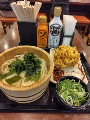 今日は店内 昨日夜はかしわ天うどん弁当でしたが、明日までの大根おろし無料クーポンを使いに来店 うどん札10枚と大根おろし無料クーポンでお会計は天ぷら350円😊 なばなは揚げ途中だったので会計後に席まで持って来てくださいました♪天つゆに大根おろしを入れましたが、なばなが大きくてすくいやすかった