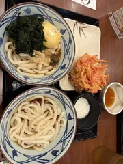 2026/3/12今日の夕ごはん ぶっかけうどんもう一杯無料を目当てに、奥さんと近所の丸亀に行きました。まず、わたしがぶっかけうどん温の並をオーダー、もう一杯が来たところで女性の店員さんに『シェアしてもいいのですか?』とお聞きしたところ、『大丈夫ですよ』と満面の笑顔☺️でお答えいただきましたので、明太子をトッピングしてしまいました。