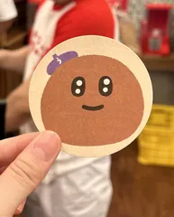 渋谷道玄坂店!うどーなつのトッピング、たこさんウインナー、目と口もちゃんとあって手が込んでます〜🐙(私の家は大概、足だけ🐙さんでした😅) そして客席の仕切りの上にはアヒル隊長たち!壁紙にも丸亀うどーなつの文字が!! 特注なんですね✨✨✨ 他にもプラフォークがカラフルだっ