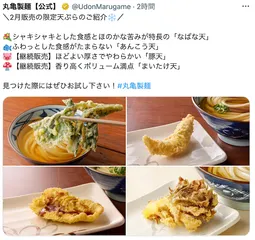 Xの公式アカウントで、2月の限定天ぷらが発表されていました。 シャキシャキとした食感とほのかな苦みが特長の「なばな天」 ふわっとした食感がたまらない「あんこう天」 【継続販売】ほどよい厚さでやわらかい「豚天」 【継続販売】香り高くボリューム満点「まいたけ天」&