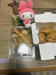 お弁当と天ぷら かき揚げに今頃ハマってます!美味しい😋総選挙のかき揚げも楽しみですね♪