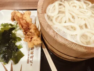🪵久しぶりの桶🪵 釜揚げうどんをいただきました🥢 今日は休日だったので前日から釜揚げうどんの日に伺えるのを楽しみにしておりました〜😆 ねぎや生姜、すりごまなど定番の薬味はもちろん、釜揚げうどんにわかめを入れるのも凄く美味しい♪ ここ最近は釜揚げうどんを自分が注文した時は丼の器