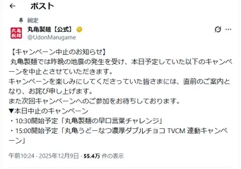 既にご存知かと思いますが 【キャンペーン中止のお知らせ】 丸亀製麺では昨晩の地震の発生を受け、本日予定していた以下のキャンペーンを中止とさせていただきます。 キャンペーンを楽しみにしてくださっていた皆さまには、直前のご案内となり、お詫び申し上げます。 また次回