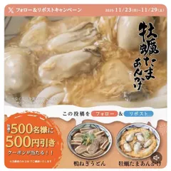 フォロー&リポストキャンペーン4日目 丸亀製麺のX公式アカウントの「しみわたる冬の定番が帰ってくる!キャンペーン」4日目が始まっています。フォロー&リポストすると、500円引クーポンが500名に当たります! どなたか当たったという方、いらっしゃいませんか?