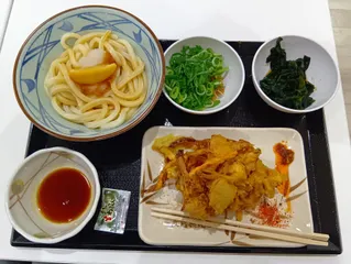 娘の晩御飯しか要らないので丸亀製麺へ✨今年初! 本日の黒板✨窓には素敵なサンキャッチャー的な?揚げもみじまんじゅう🍁 残念ながら年明けうどんは売り切れ🥲 冷ぶ(小)を注文。するとうどんと共に小鉢に入ったねぎを置かれて。ん?何ですか?と聞くとねぎが少ないのだそう。物流が止
