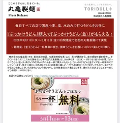 プレスリリースの注意事項によると ご注意事項: ※小サイズ、『丸亀お子さまもちもちセット』等、各種セットは対象外です。 ※一杯無料でプレゼントするうどんは『ぶっかけうどん』並サイズのみです。 サイズ変更などはできません。 ※商品ご購入時に一杯無料分の『ぶっかけうどん』並サイズをお渡しします。 ※一
