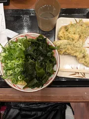 かけうどんになばな天です😊なばな天は又揚げてもらっちゃいました✨ 隣に座った御婦人がTVのコマーシャルを見て一度入ってみたかったと仰っていました!並を注文したそうで量が多くて食べるのが大変だったそうで、私の丼を見て、どうやって頼むのか聞かれました。レシートを見せてもらうと、かけの並になって