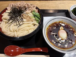 旨辛! 9月中旬に遡るのですが、先日のキャンペーンクーポンを頂いたので豚つけ汁うどん&3玉まで同じ値段と言う事で勿論3玉をチョイス🤤つけ汁はラー油入りですがペースは甘め。ゆで豚も柔らかでうどん札でもろた大根おろしもいいアクセント🫶🏻うどんも喉越し良くてのみものなのでスルスル余裕でした🐴🎯