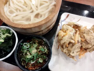 家内はマイペースうどん 冷かけが期間限定だと言っても、我が道を歩む家内は温かけうどんをオーダー。温かいスープにわかめが合うと言い、普段より多く入れていました。ちくわ天を選ぶかと思いましたが、今日はさつまいも天に。大半の女性が好きなさつまいも天もお気に入りの様です。