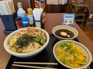 お腹いっぱい お昼ご飯につけ汁豚うどん なんとか食べきりましたがコスパいいです