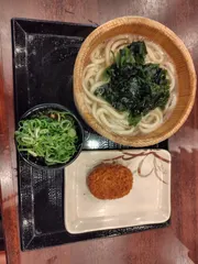 釜揚げ。 コロッケ付けました。天ぷらはどうも衣の油が気になって。おにぎり欲しいな。ホームではないんです。いなりしか。