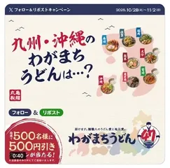 キャンペーン最終日 Xの公式アカウントの「わがまちうどん47 キャンペーン」いよいよ最終日です。フォロー&リポストで、500円引きクーポンが500名に当たります! 応募期限は11/3(月・祝)12:29までです!