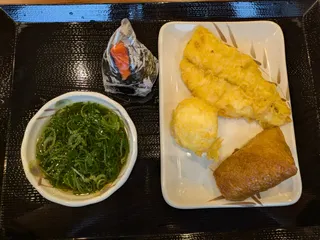 うどんではなく…😓 たまにはうどんじゃないMENUで❣️ いなりと、おにぎりは明太子😋大好きな黄金かれいと半熟たまご天をおかずにして、もちろんかけ出汁スープもいただきました!ネギと生姜でテンションMAX!! 半熟たまご天、中の黄身がお皿につかないように、倒れないように…と気をつけるのだけど、どうして