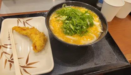 昨日のお昼ご飯🐷わたしは鴨ねぎうどんとちくわ天、旦那さんは肉がさね玉子あんかけ(大)とかしわ天をいただきました♡