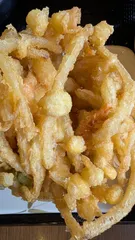 お店に行ったら今月のかき揚げ「コーンとチーズのかき揚げ」がなかったので、店員さんへ揚げて貰えるか聞いた所、「もうすぐ出来ます」との事で念願の揚げたてを食べる事が出来ました!コーンの食感と所々に散らばってるサイコロチーズが口の中に広がって最高でした。彩りにアスパラも入ってました!また次の休みの日に食べ