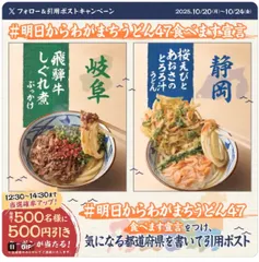 キャンペーン2日目 丸亀製麺のXの公式アカウントの、「明日からわがまちうどん47食べます宣言 キャンペーン」2日目がはじまりました。 #明日からわがまちうどん47食べます宣言 をつけて、気になる都道府県を書いて引用ポストすると、500円引きクーポンが500人に当たります。 2日目の応募期限は10/2