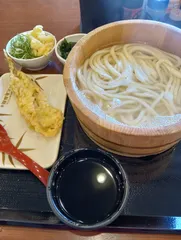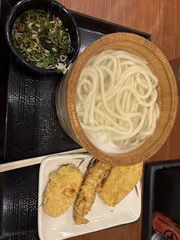 釜揚げうどんパート1 毎月1日恒例の釜揚げうどんの日参戦してきました🐢予想通り大行列でしたが何とか食べれました🌺 釜揚げうどん特にかしわ天ぷらクーポンあったので無料で食べれました😋
