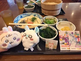丸亀行ってきましたよ〜ん‼️明太クリームうどんをリピ✌️明太トピで😍かけうどん小にトピもりもり最高👍いなり2個〜😁さすがに腹パンパン🤣余は満足じゃ😍😍😍丸亀最高👍うまし🤩ドラゴンボールうどん札は...ついに⁉️coming soon