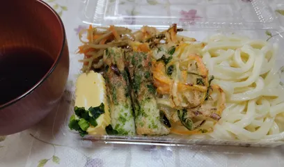 お弁当の残りとちょっとかき揚げを添えて🎵なんちゃってうどん弁当作りました☺️