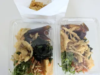 はじめてのうどん弁当 いただきます。遊んで疲れたので、今日は楽させてもらお!海老天とまいたけ天のうどん弁当美味しそう!