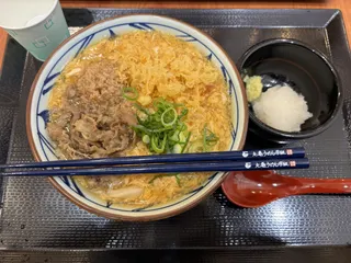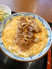 肉の たまごの あんかけやで ウマくないわけがないやろ! 冷たいかけうどんが消えるときに夏の終わりを感じるのだとすれば、玉子あんかけの到来は冬の訪れを感じさせてくれる……丸亀は四季とともに。猫舌なのではふはふしながらいただいております。身体の芯からあったまる〜