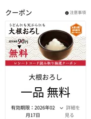 昨日の丸亀製麺来店したレシートスキャンクーポン大根おろし無料クーポン当たりました🎯