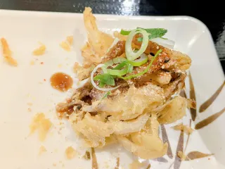 かき揚げは 半分お持ち帰りにして半分はソース 胡麻 七味 葱で食べます