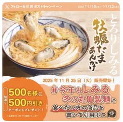 X公式アカウントの「今年もしみる冬の丸亀製麺 キャンペーン」2日目がスタートしました! #今年もしみる冬の丸亀製麺 を付け、食べたいほうの商品を書いて引用ポストすると、500円引クーポンが500名に当たります!