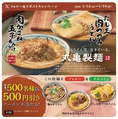 丸亀製麺のX公式アカウントで、手間ひま重ねた冬のあつあつキャンペーン1日目がはじまりました。①@UdonMarugameをフォロー②フォロー&リポストキャンペーンの投稿をリポスト抽選で500名に500円引きクーポンが当たります。狭き門ですが、ぜひチャレンジしてみてください😊
