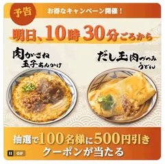 またまた新しいキャンペーンが開催されます 丸亀製麺のX公式アカウントで、あす1月13日 10:30から、丸亀製麺の手間ひま重ねた冬の商品にまつわるチャレンジ企画が開催されるそうです。抽選で、100名に500円引クーポンが当たります!これは応募するっきゃないですね。