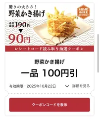 貯まってます 野菜かき揚げ100円引きクーポン、最近よく出るんですよね。 3枚貯まってます笑