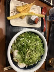 今日は釜あげの日 今月も娘と釜あげエビ天、イカ天、明太子おにぎりかしわ天、イカ天、ちくわ天、いなりサイコーでした🎵