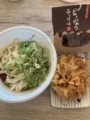 いつもは、ざるうどんしか食べないのに、なぜか肉ぶっかけ冷や食べてる(笑)😲‼️そして定番のうどーなつ🍩かしわ天1個は、分けるぶん。