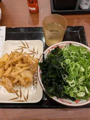 『 明太釜玉うどん』にしようか悩んだが⋯辛い味にしたかったので、『 かけうどん』にして、無料トッピングを使用した🥢無料トッピングがモリモリになってしまった😅