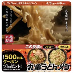 うどんとごはんをソースで焼いたッ?キャンペーン6日目🔥✨ 丸亀製麺のX公式アカウントの「うどんとごはんをソースで焼いたッ?キャンペーン」、6日目がはじまりました。応募方法は簡単。@UdonMarugameをフォローし、該当の投稿をリポストするだけです。抽選で500名に、500円引きクーポンが当たります。6日目の応募期限は4/9(木)13:59まで!ぜひ、応
