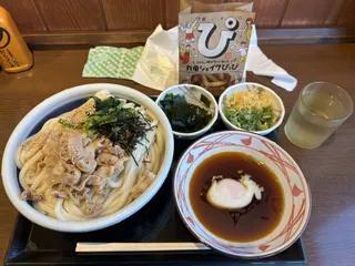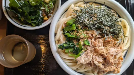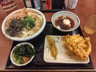 お昼ご飯(2025.09.13) 今日は『旨辛豚つけ汁うどん(3玉)』と『かしわ天』と『子持ちししゃも天』を食べてみた。 本音はもう3玉ほど食べたかったけどね。 因みに、母親は、『かけうどん(小)』と『野菜かき揚げ』と『いなり寿司』を食べたとか。