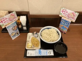 フードコート店 朝8時から最寄りの映画館で映画を梯子。子ザメちゃんは、貸切🤣タローマンは、なんだこれは!の連続で、面白かったです🎦 その後、フードコートで丸亀製麺😋その店舗は、映画の半券提示で、うどん並→大サイズアップ無料なんです。とろ玉うどん大と野菜かき揚げ、ちくわ天。トッピングにわかめ、しび辛ラー油、