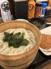 釜揚げうどん、丼ではなく桶が良いですね😊わたしはやはり桶の時の方が食べる時の気分も違います。 コロッケは冷めにくい、確かにですね👀‼️あと、コロッケの安定した美味しさは間違いないと思います✨わたしも次なる天麩羅探索は、かき揚げ総選挙の#4に臨みたいと思います!