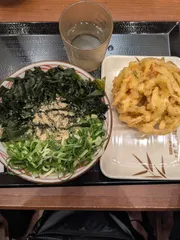 かけうどんに野菜のかき揚げです😊1時に近い時間でしたが大行列でした。 目当てはなばな天でしたが余りにもショボいなばな天で手が伸びず、揚げたてっぽかった野菜のかき揚げにしました😊28日までの100円引きクーポンがあって良かったです😊 今日は暖かい日でしたので冷やがよく出ていたそうで