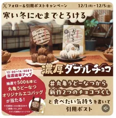 Xの公式アカウントで、丸亀うどーなつから新作2つのチョコづくしキャンペーンがはじまりました。 ①@UdonMarugameをフォロー②#丸亀うどーなつから新作2つのチョコづくし を付け、食べたい気持ちを書いて👆の投稿を「引用」ポスト 500名に丸亀うどーなつオリジナルエコバッグが