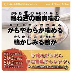 NEW 早口言葉チャレンジ3日目 Xの公式アカウントの、丸亀製麺の早口言葉チャレンジ【初級編】3日目がはじまりました。 ①@UdonMarugameをフォロー②#鴨ねぎうどん早口言葉チャレンジ を付け、チャレンジ結果を書いて👆の投稿を引用ポスト 抽選で3日間合計300名に500円引クーポンが当たります。