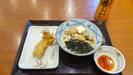 早速本日の昼は丸亀さんにしました! (少々長くなりますがお許しください🙇♀️) 車を飛ばし、念願の牡蠣バターぶっかけにありつくことができました🥰 近くの店舗ではやっていなかったし、前に此処の店舗に来たとき売り切れで食べれなかったから嬉しすぎます✨ 思わず天ぷらとうどーなつも買ってしまい、食べ過ぎか