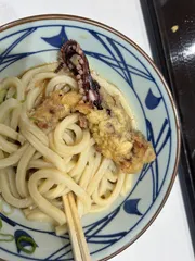 安定の お昼に丸亀へ安定の釜揚げうどん🩷うどん札貯まってたから娘のかけうどんに使おうと財布をガサガサしていたら、うっかり天ぷらのおさらを取り忘れる失態💦紫いかげそ天は娘のお皿に同居させてもらいました(なので写真はうどんのみ)