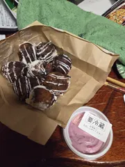 寒い🥶こんな日は玉子あんかけです生姜たくさん入れてポカポカに😊 やっと豚天発見💡豚肉が柔らかい✨だしソースがピッタリ! うどーなつご褒美チョコ🍫リピート!そしてディップソースGETリベンジ成功です🎵 ごちそうさまでした😋