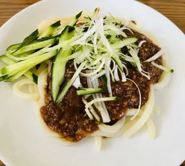 ジャージャーうどん-お家うどん① 中々丸亀に行く機会に恵まれず🥲お家うどん。家計の味方業務スーパーの冷凍うどんを解凍して冷水で締めてお家にあった肉味噌を乗せてきゅうりと白髪ネギ乗せて完成。丸亀のお出汁が恋しいけど濃いめの肉味噌と絡ませたうどん。これはこれで美味しかったです😋