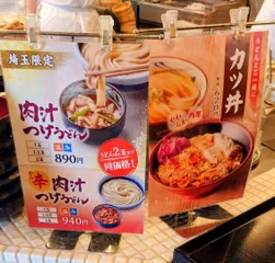 🐢に埼玉県限定の肉汁つけうどん食べに行ったら、カツ丼ありました😙(ちなみに行った事あると思いますが🐢富士見店です)外に肉汁つけうどんのPOPが貼ってありました😀汁が風で剥がれかかっていましたが📸で撮るので手🫱で直そうとしてけど剥がれてしまいました😅