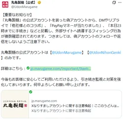 【重要なお知らせ】(2025年12月3日午後4時40分地点でのX【旧Twitter】より) 「丸亀製麺」の公式アカウントを装った偽アカウントから、DMやリプライで「他社様とのコラボ」、「PayPayマネーが当たりました」、「本日23時までに手続き」などと記載し、外部サイトへ誘導するフィッシ