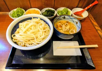 肉つけうどん冷2玉を注文しました🥢 肉つけうどん冷2玉を注文しました🥢店舗限定の山菜うどんあると思い行きましたが無かった(うどん札2/28迄のでおろし使うつもりてした🙍)冷ぶっかけ小に鶏めし(鶏🍙しかない)カレーうどんにすればよかった😗もう寒い季節でなくなってきたので冷2玉にしました😙🐢ネギ・わかめ・天かす・七味をかけました😙後で小鉢